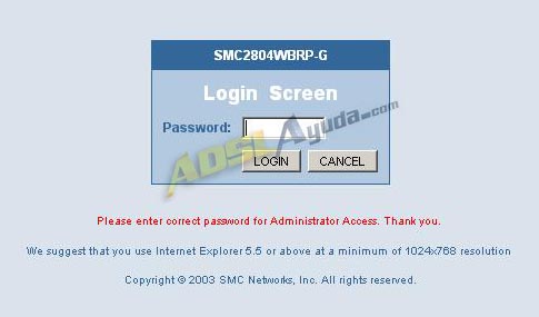 Abrimos un navegador en la máquina que esté conectada al router y accedemos a la dirección IP local del router, o sea, la misma que la Puerta de enlace que tenga la máquina que podemos ver con el comando MS-DOS ipconfig. Nos saldrá la siguiente pantalla y nos pedirá un password que por defecto es smcadmin: