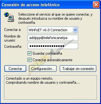 El WinPoET se instala como una conexión de acceso telefónico, y se comporta como tal. De esta manera, por defecto nos pedirá que establezcamos la conexión para acceder a internet: