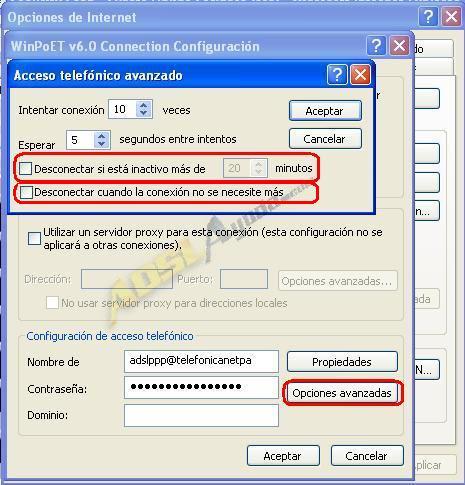 Y por último, para que no se desconecte pasados 20 minutos de inactividad, pulsaremos el botón Configuración y luego en Opciones avanzadas. Quitaremos la marca de las casillas Desconectar si está inactivo más de xxx minutos y Desconectar cuando la conexión no se necesite más.