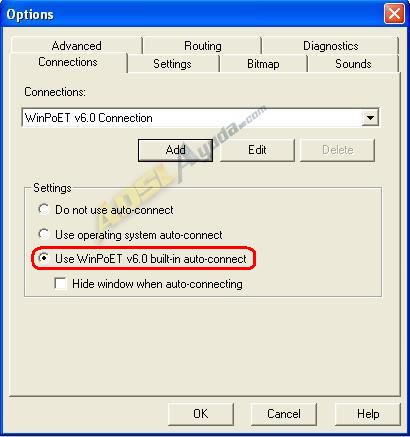 En la pestaña Connections marcamos la casilla Use WinPoET v6.0 built-in auto-connect. De esta manera, cada vez que se ejecute el programa, conectará automáticamente. Con la anterior opción y con esta, se iniciará cada vez que arranque windows y además conectará él solo.