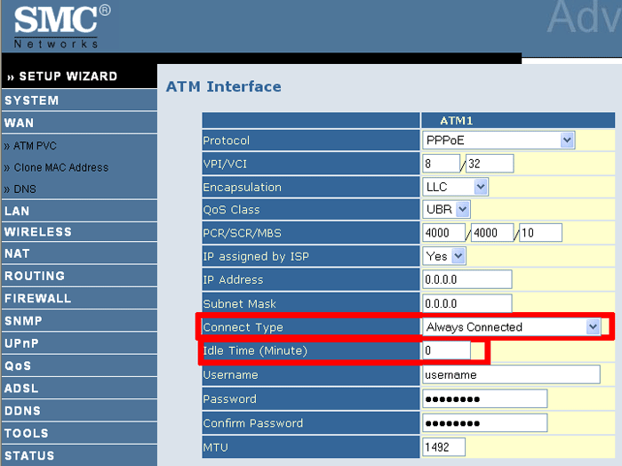Estos dos comportamientos se deben cambiar si queremos que el router este conectado a internet en todo momento, para ello debemos ir al apartado WAN -> ATM PVC, la pantalla que nos aparecerá será similar a esta: