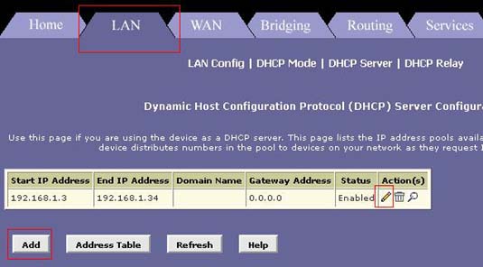 Es importante tener en cuenta que si cambia la configuración IP del Router también tendrá que cambiar el DHCP para asignar las direcciones IP automáticamente a nuestros equipos. Esta configuración la realizaremos desde la pestaña LAN opción DHCP Server añadiendo en ADD o editando (imagen del lápiz) la configuración establecida.