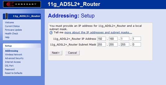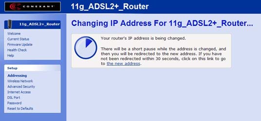 Hacemos clic en Change 11g_ADSL2+ Router address settings here… y nos aparecerá esta otra pantalla: