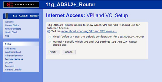 Nos pide si queremos usar el VPI/VCI fijado por el router o definirlo manualmente, seleccionamos Manual y pulsamos en Next, mostrandonos esta nueva pantalla: