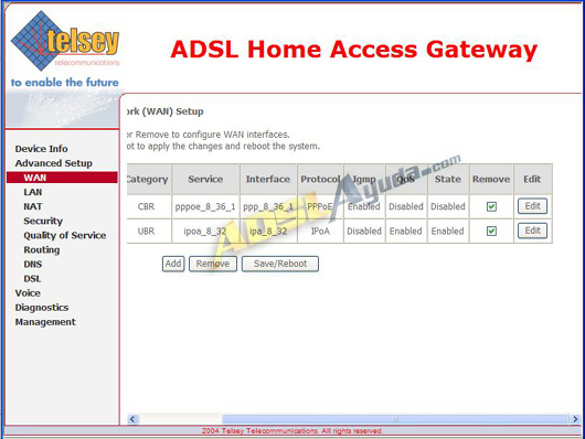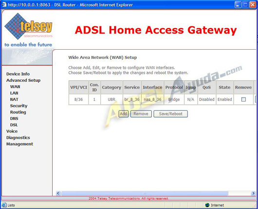 Vamos al apartado Advanced Setup -> WAN. Si tenemos una configuración existente, la mejor opción es borrarla para así partir de 0. Marcamos las casillas Remove para a continuación pulsar el botón Remove.