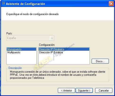 Siguiente paso, seleccionar Monopuesto y Dirección IP Dinámica.