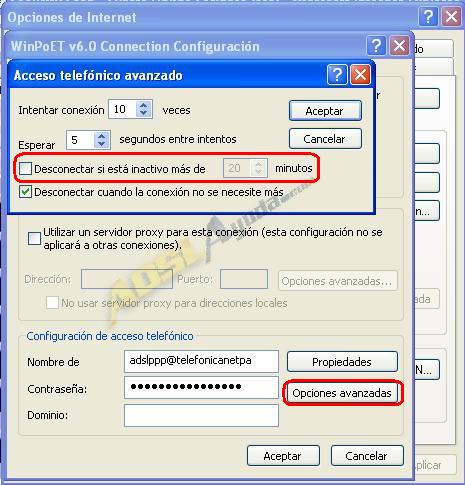 Y por último, para que no se desconecte pasados 20 minutos de inactividad, pulsaremos el botón Configuración y luego en Opciones avanzadas. Quitaremos la marca de la casillaDesconectar si está inactivo más de xxx minutos.