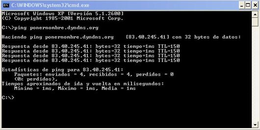 A partir de ahora, podemos localizar nuestro router de varias maneras. La más sencilla para obtener nuestra IP pública sería un ping al dominio que tengamos en uso. Para ello abriremos una ventana de ms-dos (En Win XP Inicio, Ejecutar, cmd)