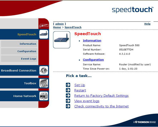 Para realizar la configuración desde el principio resetearemos el router pulsando durante más de 10 segundos el botón posterior de reset. Abrimos el navegador e introducimos su dirección IP. Por defecto es 192.168.1.254. En el primer acceso no debería pedirnos usuario y contraseña. En algunas versiones de firmware para el thomson 510 el usuario es Administrator y la contraseña está en blanco.