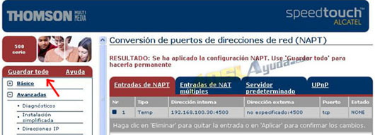 En el ejemplo anterior, hemos redireccionado el puerto 4500 TCP al PC cuya IP es 192.168.0.30.