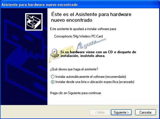 Si la instalación no continúa automáticamente al introducir el disco (caso de XP), debemos seleccionar la opción Instalar desde una lista o ubicación específica (avanzado), para indicarle el directorio de donde debe obtenerlos. Pulsamos en Siguiente> y localizamos el driver correspondiente para que continúe la instalación.