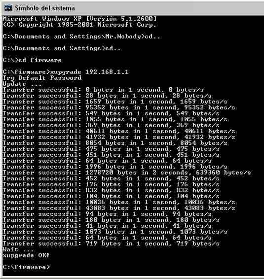 - Una vez dentro ya solo te queda poner «xupgrade 192.168.1.1» ( será esta del ejemplo suponiendo que no cambiaste la IP del router por defecto , si no es 192.168.1.1 la IP de tu router pon la que usaste tu ) y pulsar enter.