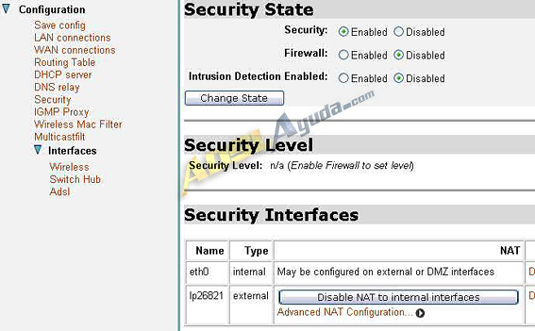 - Dentro de la ventana principal en Security Interfaces justo debajo del botón Disable NAT to internal interfaces ve el enlace de Advanced NAT Configuration , pínchale y entrarás.