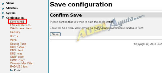 Nos quedaría guardar los cambios para que no se pierdan si el router se apaga. Para ello vamos a Configuration, Save config y pulsamos sobre el botón Save.