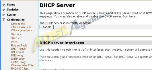 Para desactivar el servidor DHCP iremos a Configuration, DHCP server. Pulsamos el botón Disable. Previamente debemos haber configurado nuestros ordenadores con una IP de red local estática.