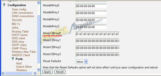 Es similar a la anterior, sólo que usa una clave más larga y, por tanto, se supone que es más segura. Para activarla iremos al desplegable Wep Encription y elegiremos el modo 128bit. Debemos utilizar las casillas correspondientes a Mode128. Las claves consisten ahora en 26 dígitos hexadecimales separados por guiones (en grupos de 2). Otra vez en el ejemplo sólo usaremos la primera de las 4 que permite el router.