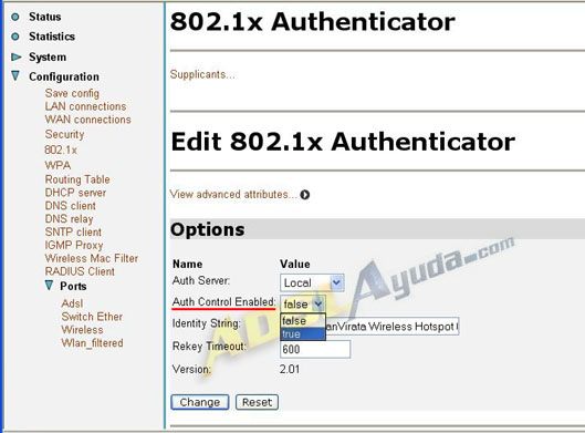 Pulsamos el botón Change para que utilice la clave a partir de este momento. Por último iremos al menú Configuration, 802.1x, donde activaremos el campo Auth Control Enable, colocando su valor en true.