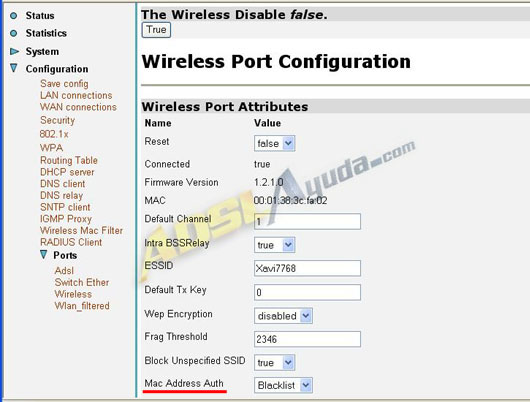 Las claves predeterminadas de acceso al router son: Usuario: 1234. Contraseña: 1234. Una vez dentro iremos al menú situado a la izquierda Configuration, dentro del mismo, al menú Ports y posteriormente a la opción Wireless.