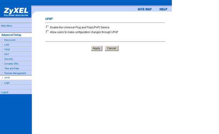 Nos aparecerá una ventana llamada Site Map que contiene todas las opciones de configuración. Elegiremos la opción UPnP.