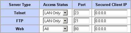 Es recomendable activar todos en LAN Only. Vamos a realizar un ejemplo de conexión remota al exterior y red local por WEB y el resto solo en red local. En Access Status de Telnet seleccionaremos LAN Only, en el de FTP seleccionaremos LAN Only y en el de WEB seleccionaremos All. Para finzalizar pulsaremos el botón