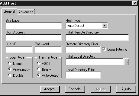 En la ventana Add Host tenemos 2 pestañas General y Advanced. En la pestaña general hay varios cuadros de texto en los que tenemos que poner los datos del FTP al que queremos acceder.