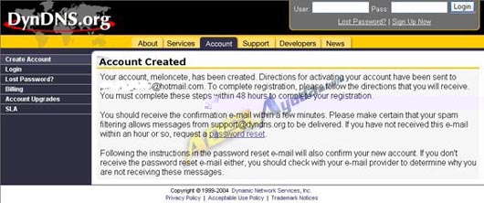 Los datos de Username y Password que introduciremos nos valdrán tanto para el acceso a nuestra cuenta en dyndns.org como para los apartados correspondientes del router. Pulsamos el Botón Create Account. En ese momento pasaremos a la pantalla de confirmación en la que se nos notifica que se nos ha enviado un e-mail a la dirección de correo introducida anteriormente.