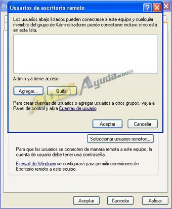 Para activar el servicio, marcaremos la casilla Permitir que los usuarios se conecten de manera remota a este equipo y pulsaremos el botón Aplicar. Ahora pulsamos en el botón Seleccionar usuarios remotos…
