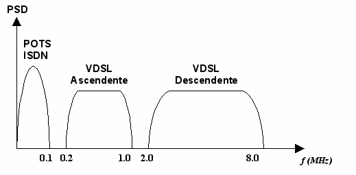 - Plan de frecuencias: En ADSL, la asignación de las bandas de frecuencias en sentido ascendente y descendente es fija (con alguna libertad en el comienzo de la banda en sentido descendente). En cambio, para VDSL se han definido múltiples planes de frecuencias para soportar diferentes mezclas de servicios.